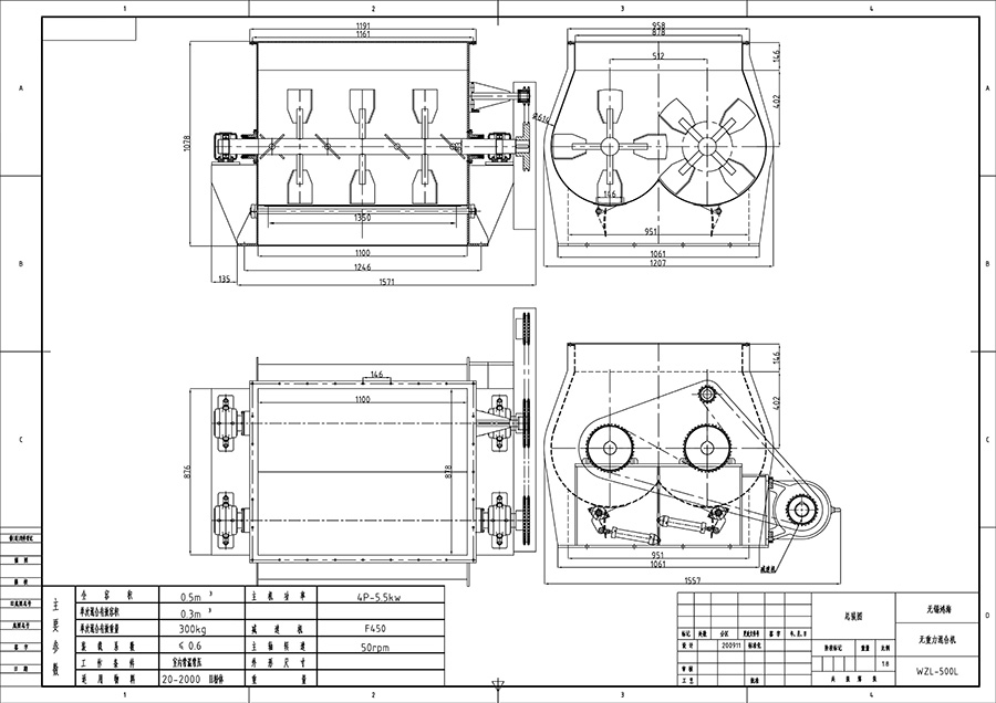 無重力混合機裝載著兩根同時異向向外旋轉的平行槳葉軸,每根軸上搭載十字槳葉,在驅動裝置的同步作用下,兩根的十字槳葉軸的運行軌跡成相交關係,且錯位齧合。驅動裝置驅使槳葉軸快速旋轉,旋轉的槳葉產生離心力,將物料有效拋灑至筒內上空部分,達到拋物線的highest點後下落(拋物線的highest點也稱為瞬間無重力狀態),物料再受槳葉的驅趕,在筒體內往複循環混合,並受雙軸的齧合空間混合、剪切、分離,致使物料快速混合均勻。
